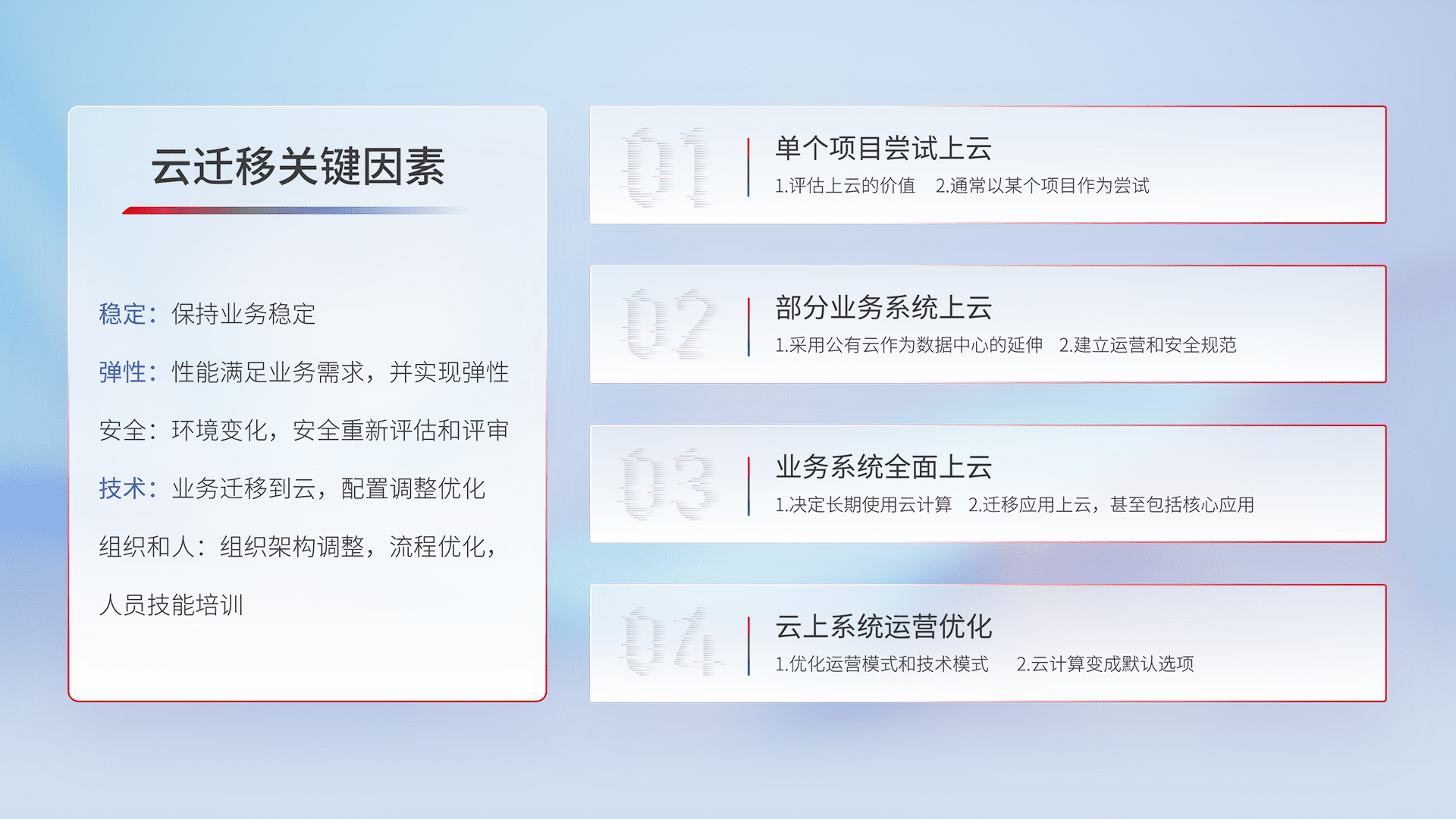 结合实际业务,,,,从规划设计、、云平台选型、、、云原生改造、、、、数据迁移、、、、集成交付,,,,迁移全过程为客户识别最佳上云路径,,做好风险识别管理,,,,设计网络架构、、、、身份权限、、安全审计合规、、、、操作审计、、日志审计、、、、监控告警策略、、多站点容灾设计等,,,,对云上基础设施进行整体规划,,,提升IT治理水平,,,,以满足弹性、、、、高可用、、高性能的需求。。。。